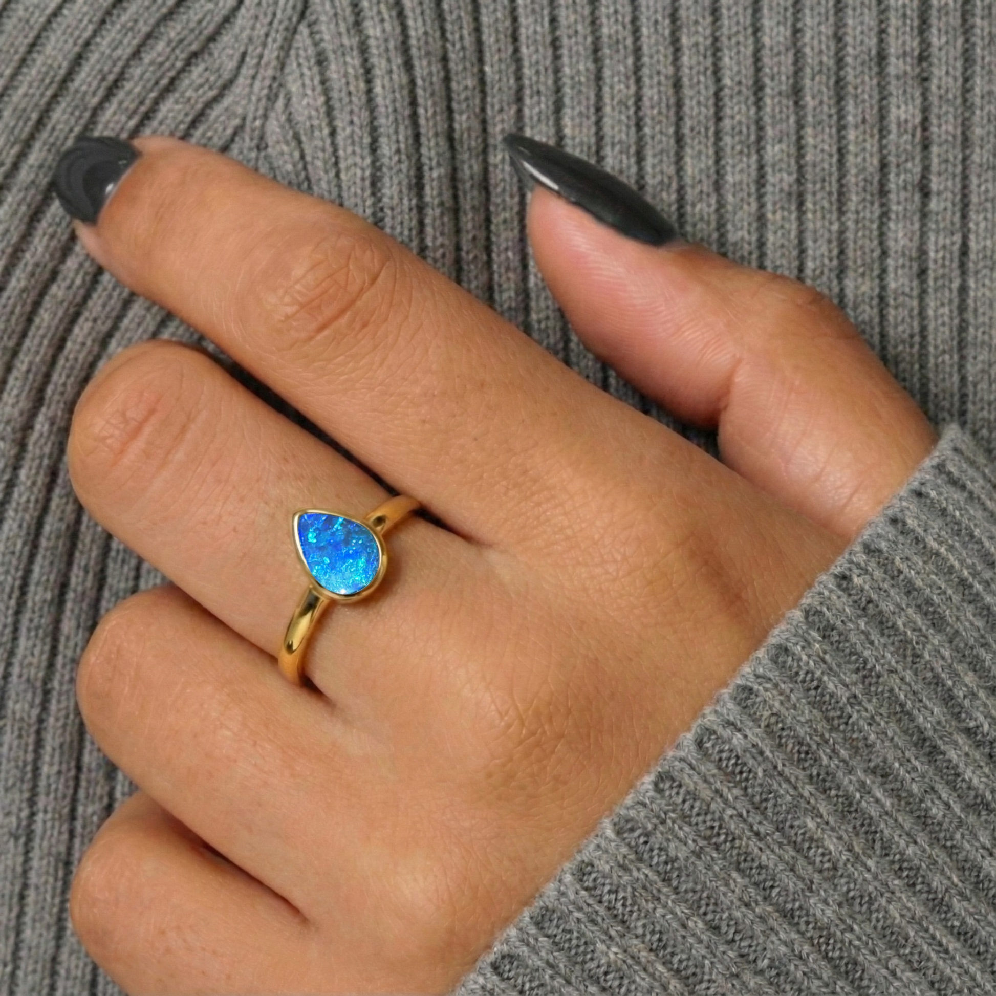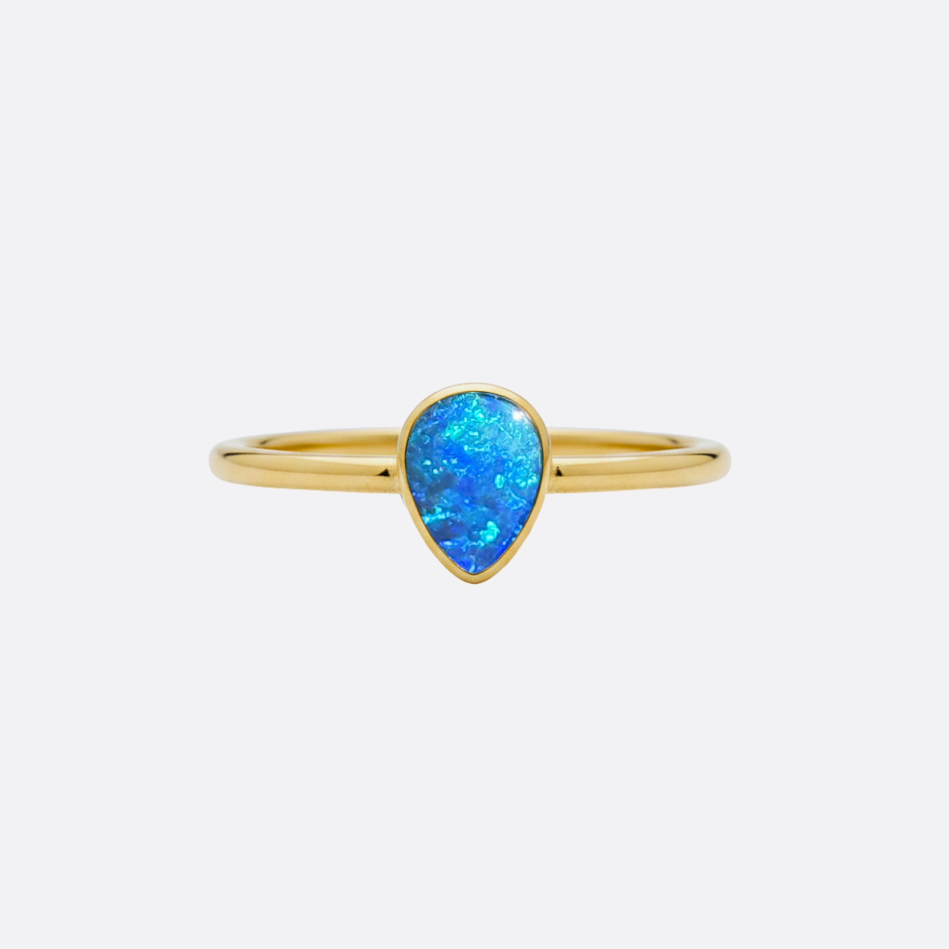 Ein Tropfen voller Energie – umrahmt von 14K Gold. Der Opal fängt das Licht in allen Farben und gibt ihm Form. Dieser Ring ist mehr als Schmuck: er spiegelt deinen Charakter.