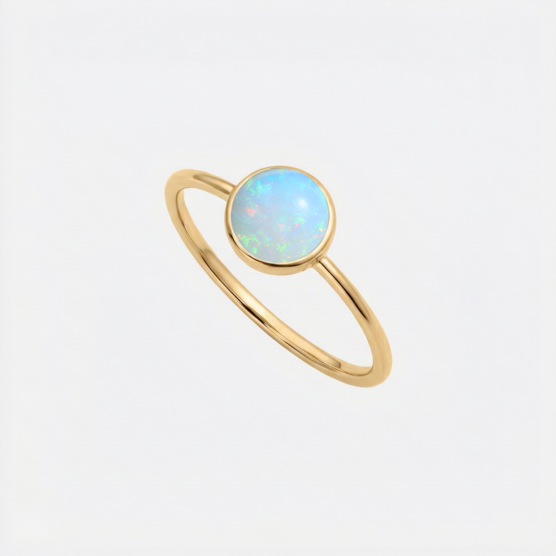 Gold in runder Form – reduziert auf das Wesentliche. Im Mittelpunkt: ein Opal, der in allen Farben leuchtet.