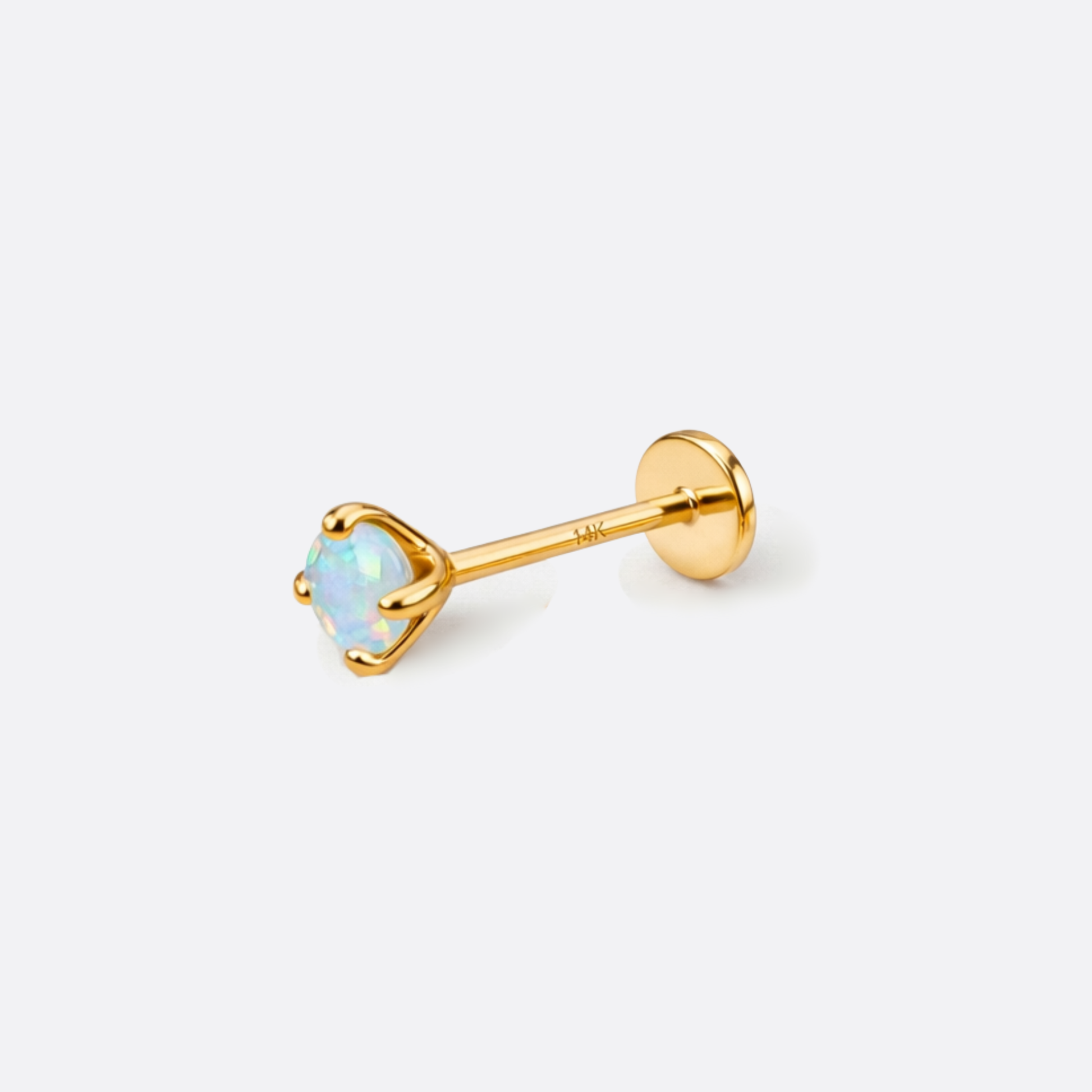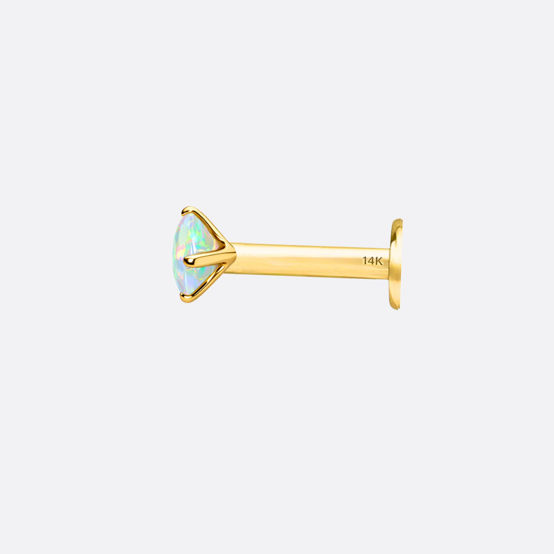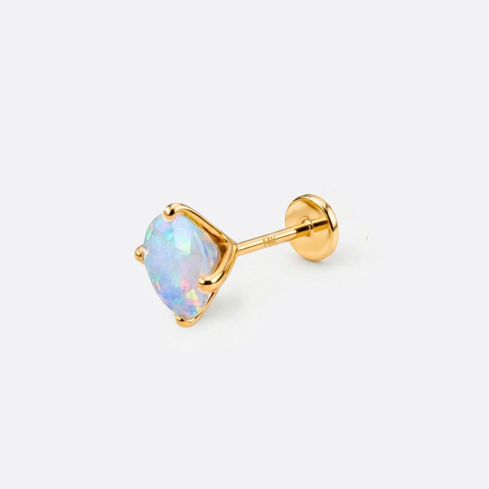 Der facettierte Schliff bricht das Licht in unzählige Richtungen – und der echte Opal antwortet mit einem Farbenspiel, das sich nie wiederholt. Gefasst in warmes 14K Gold, sitzt dieses Piercing und zieht alle Blicke an. Pures Feuer, goldgefasst. Verfügbar in verschiedenen Größen.