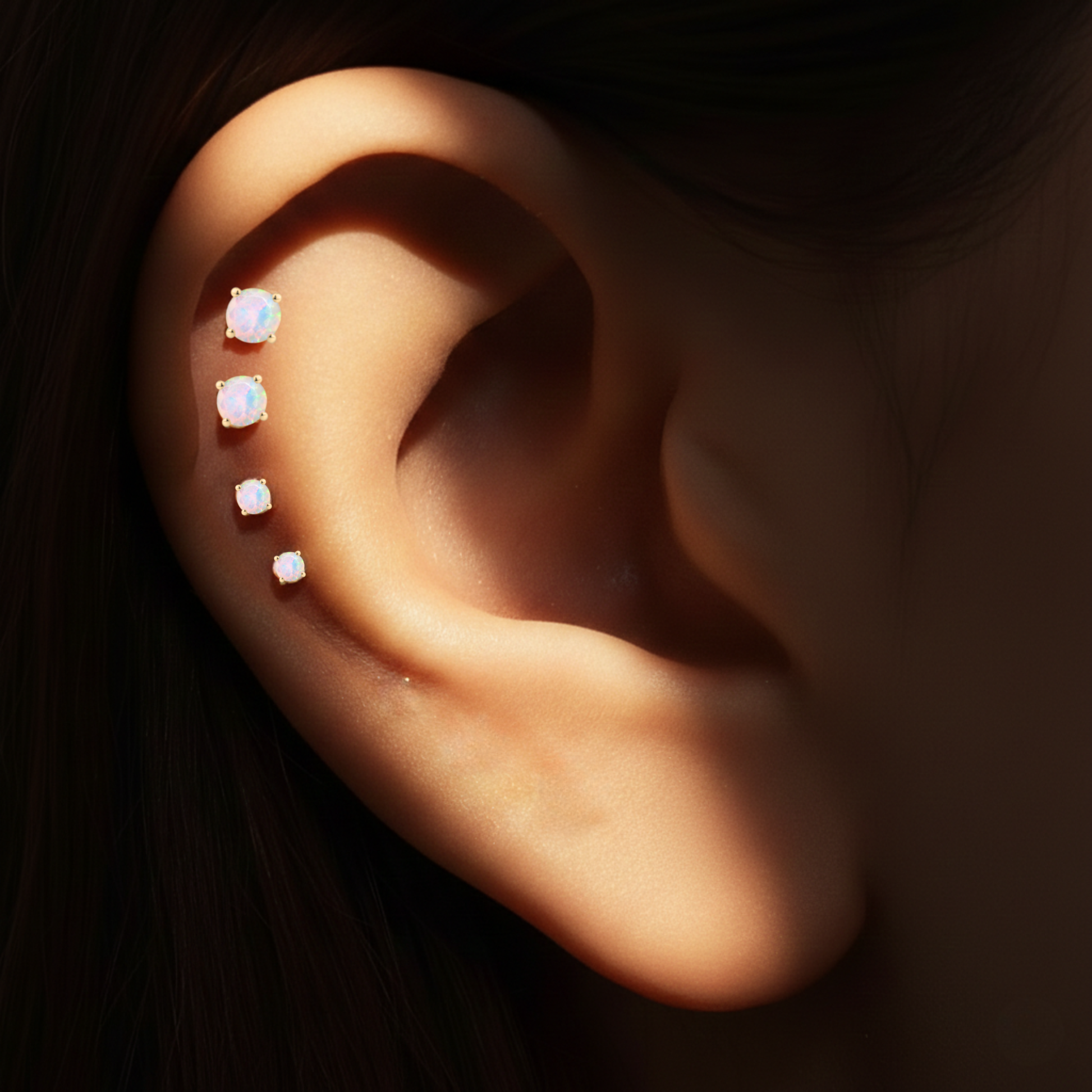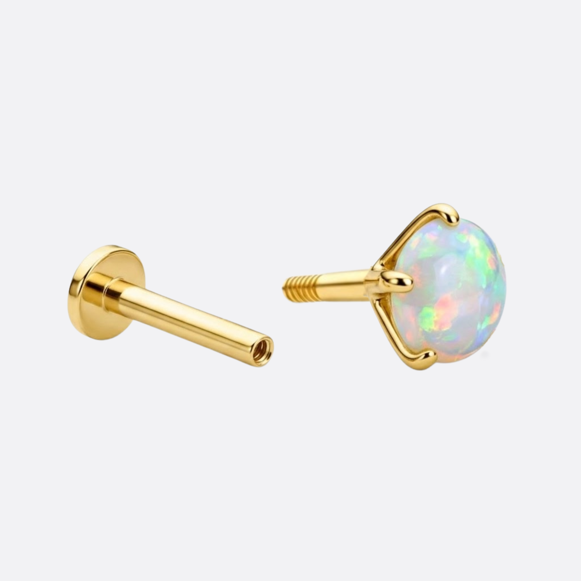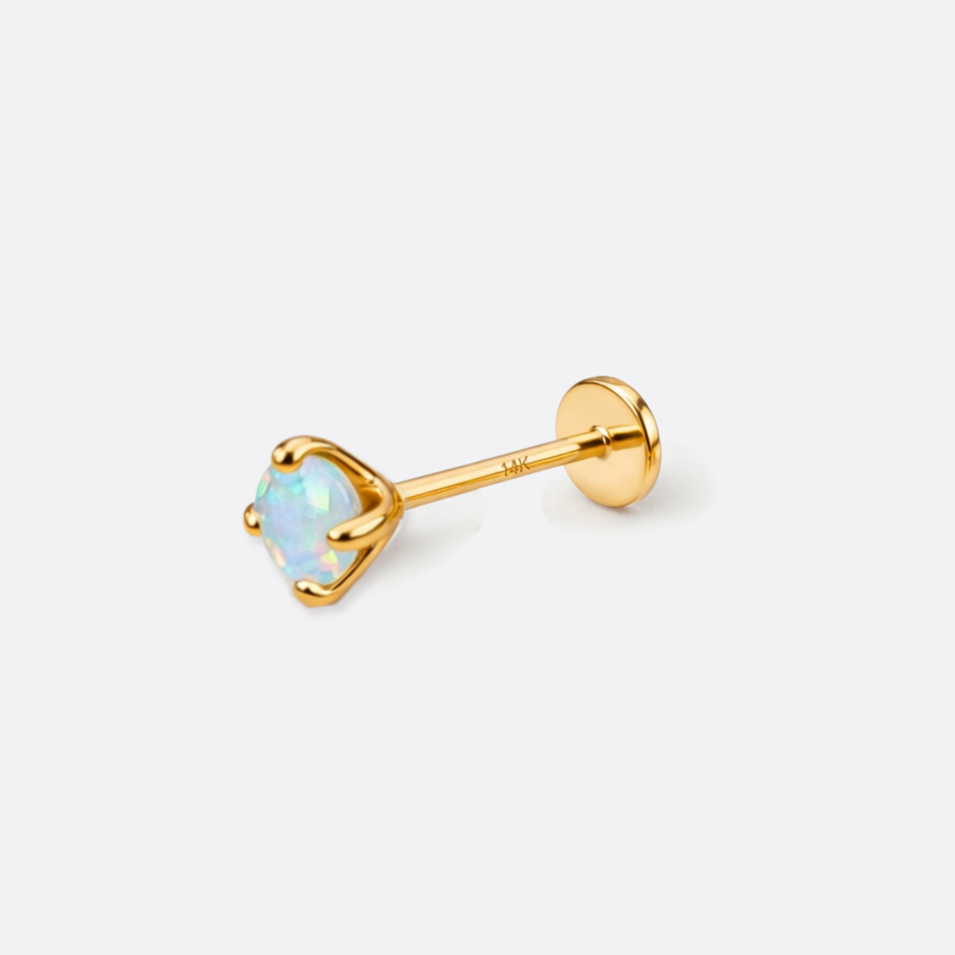 Der facettierte Schliff bricht das Licht in unzählige Richtungen – und der echte Opal antwortet mit einem Farbenspiel, das sich nie wiederholt. Gefasst in warmes 14K Gold, sitzt dieses Piercing und zieht alle Blicke an. Pures Feuer, goldgefasst. Verfügbar in verschiedenen Größen.