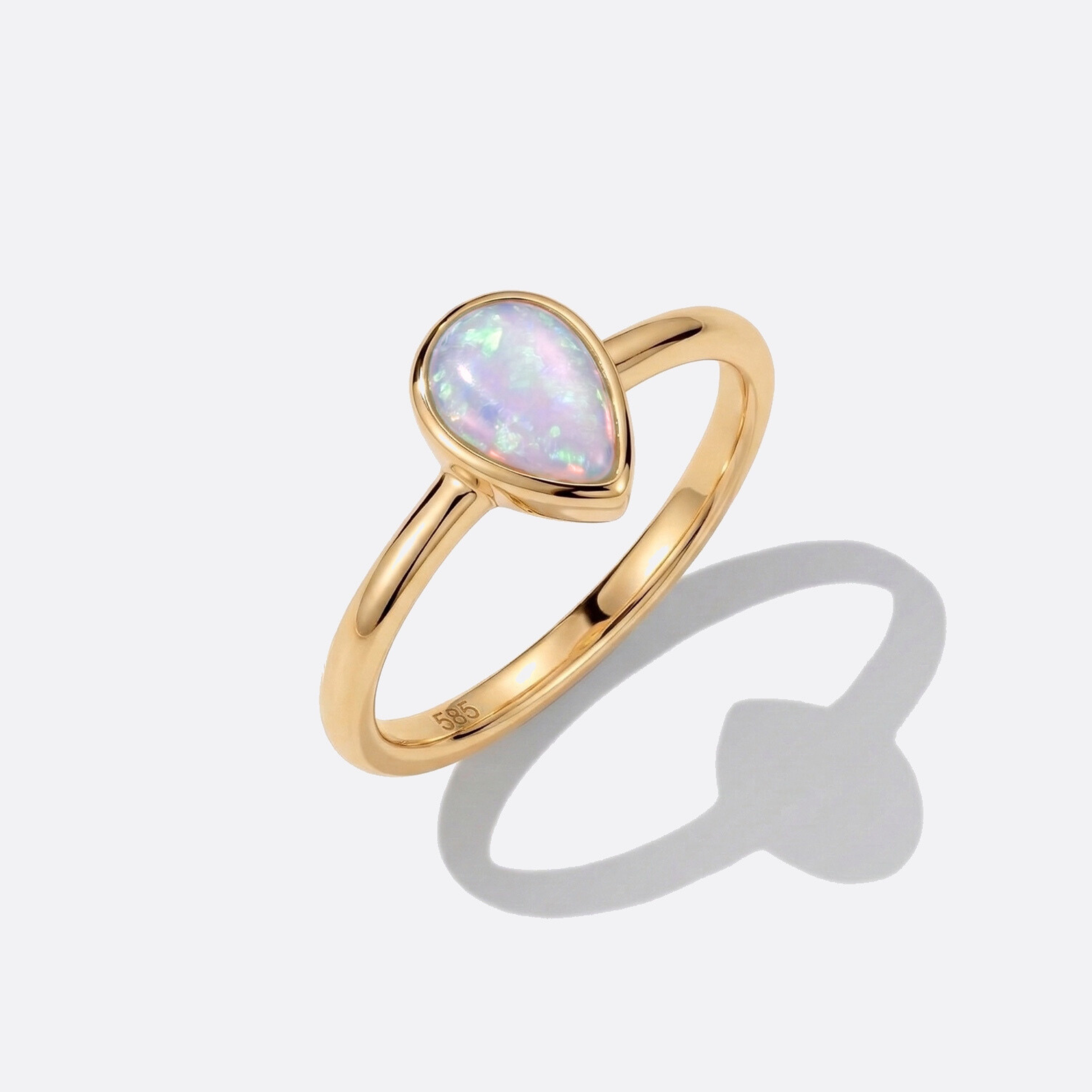 Oro a forma di goccia – ridotto all’essenziale. Al centro: un opale che brilla in tutti i colori.