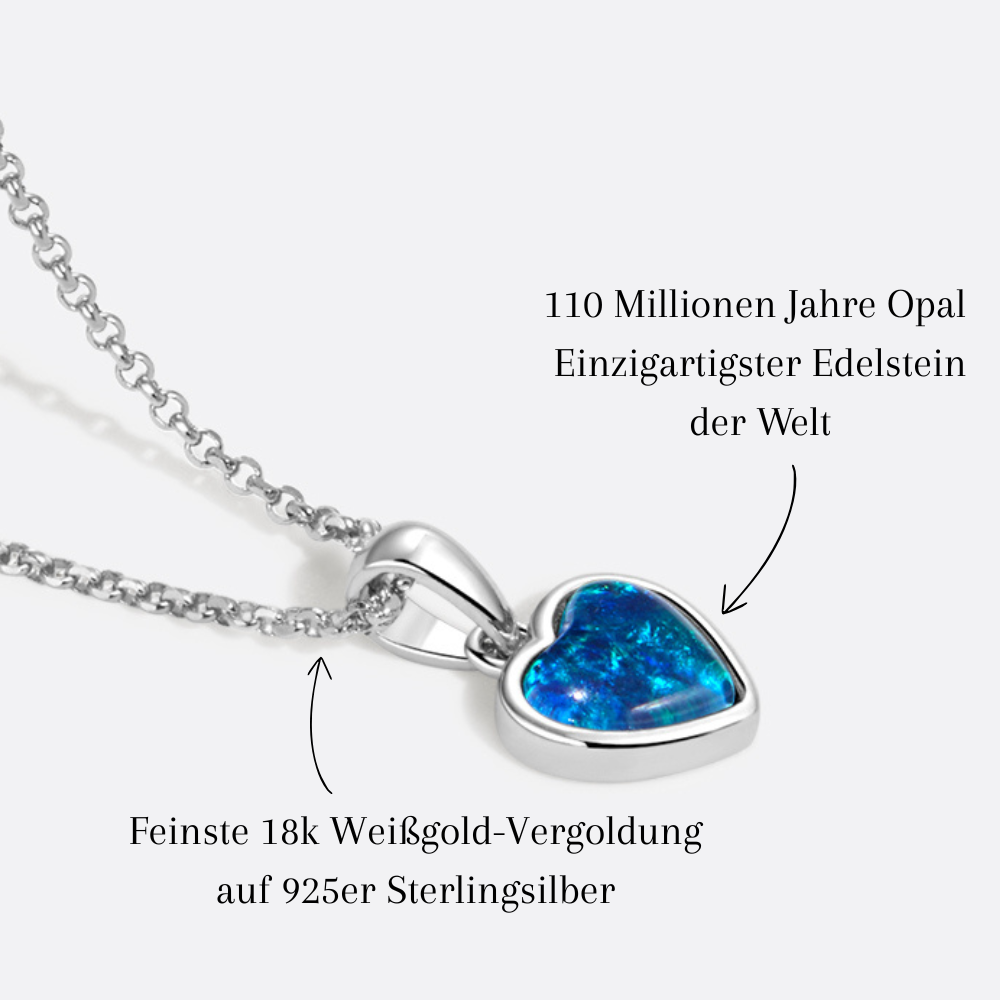 Jak serce ze światła – prawdziwy opal w intensywnym niebieskim, z turkusowymi i zielonymi płomieniami. Oprawiony w srebro pokryte 18K białym złotem. Certyfikat GSB. Symbol miłości.