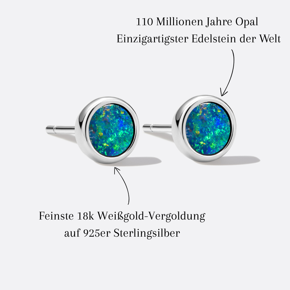 Krąg pełen mocy – te naturalne opale przy każdym świetle ukazują nowy fajerwerk barw. Okrągłe, intensywne, żywe. Osadzone w srebrze pozłacanym białym złotem 18K te sztyfty są stworzone dla tych, którzy chcą subtelnie emanować czymś więcej.