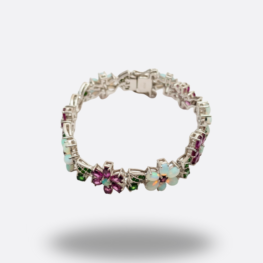 Ein ovaler Takt aus Farbe am Handgelenk – lebendig, weich, klar. Die Opale schwingen mit dir – gefasst in 925 Silber, getragen als stilles Statement.