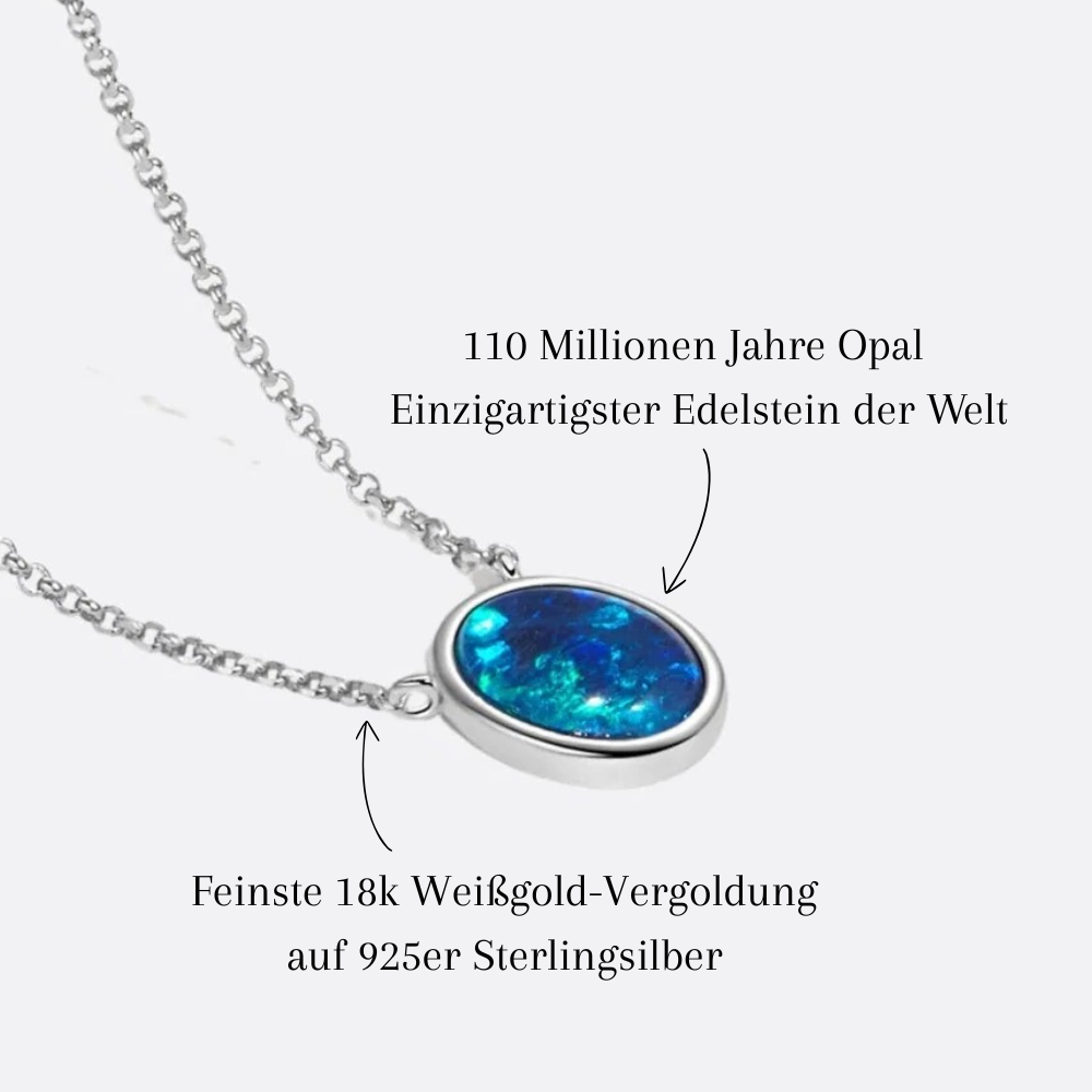 Die ovale Form steht für Fluss und Klarheit – der natürliche Opal zeigt intensives Blau, durchzogen von türkis-grünen Blitzen. Gefasst in 18K weißgold-vergoldetes Silber entfaltet sich das Farbspiel bei jeder Bewegung. Ein Stück, das Ruhe ausstrahlt und Tiefe in sich trägt.