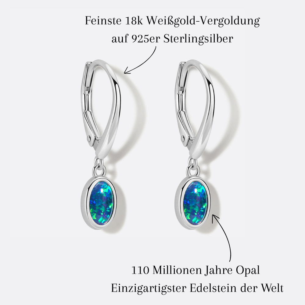 Dein Ausdruck in Farbe – bei jeder Bewegung leuchten tiefes Blau und grün-türkise Blitze im ovalen Opal auf. Die Form wirkt weich und kraftvoll zugleich. Gefasst in 18K weißgold-vergoldetes Silber strahlen diese Ohrringe, ohne ein Wort zu sagen.