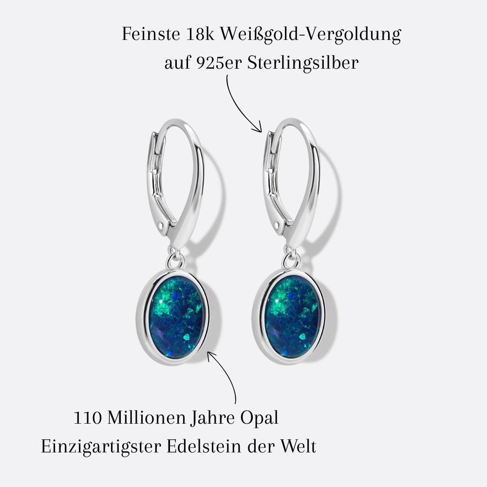 Wie ein Echo in Farbe – die ovalen natürlichen Opale leuchten in kräftigem Blau, durchzogen von grünen und türkisen Blitzen. Gefasst in 18K weißgold-vergoldetes Silber wirken die Ohrstecker ausbalanciert, klar und charaktervoll.
