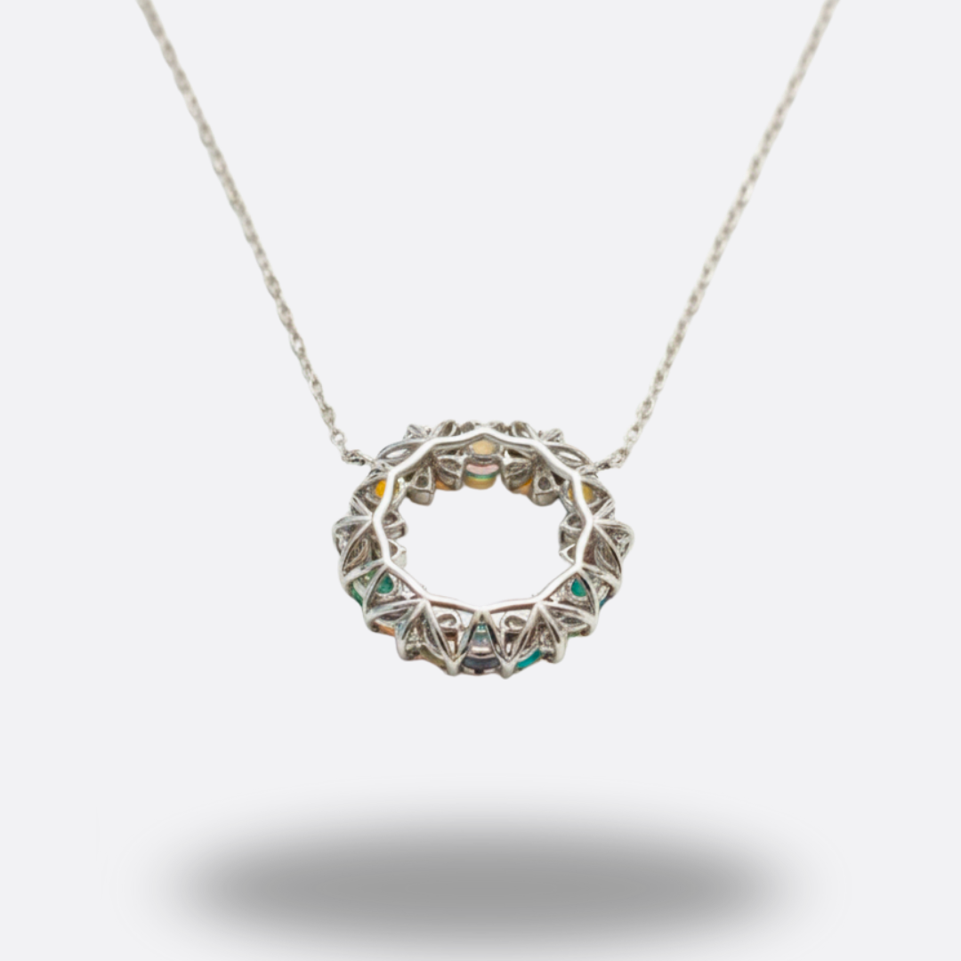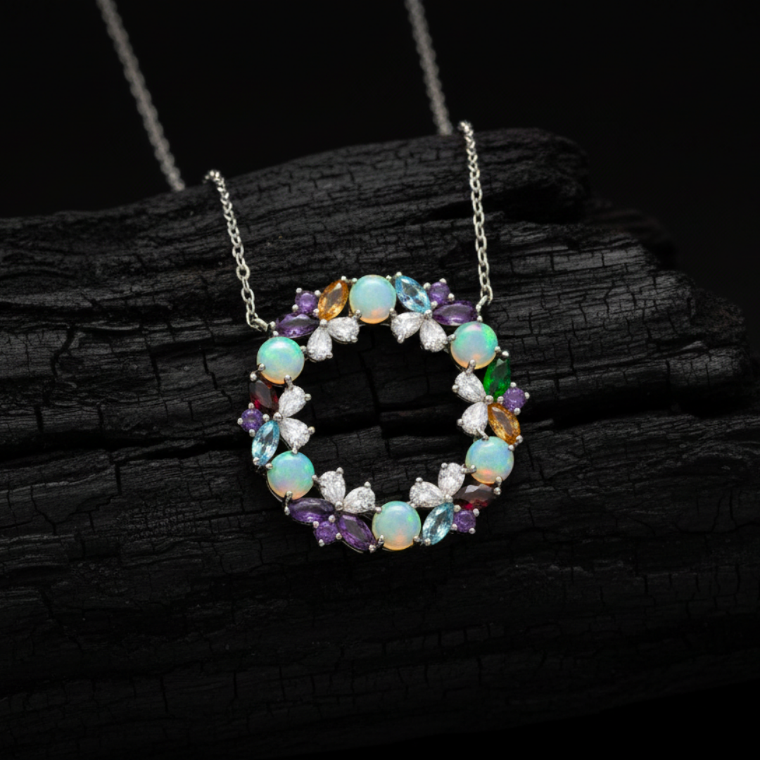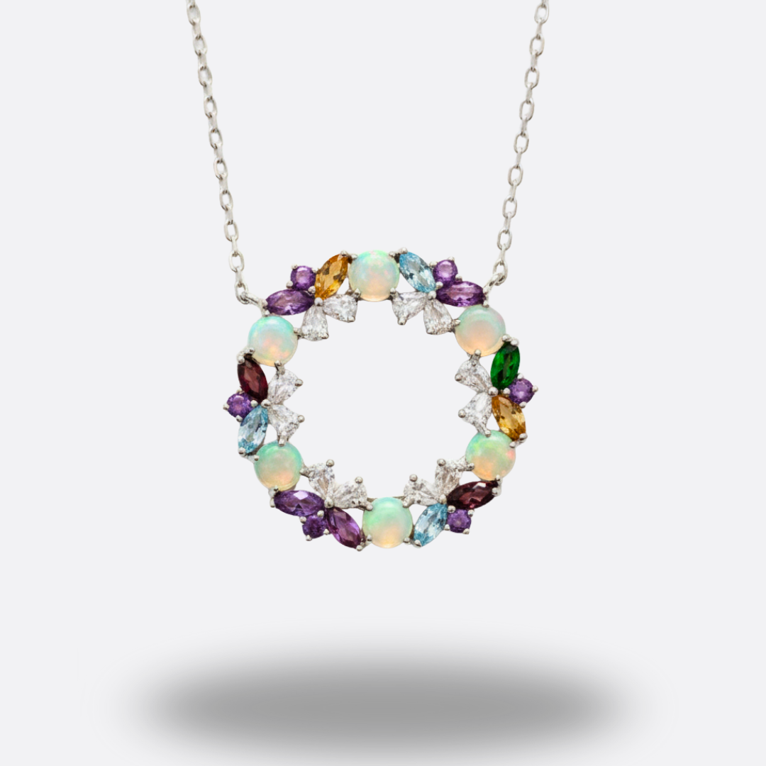 Runde Formen fließen wie ein leiser Rhythmus um den Hals. Mehrere Opale entfalten ihr Lichtspiel auf feinem Silber. Diese Kette wirkt sanft und doch präsent.
