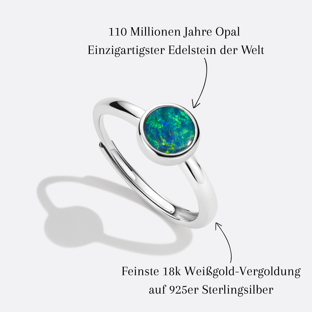 Ein runder Opal, der alle Farben in sich trägt – ein Farbfeuerwerk am Finger. Gefasst in 18K weißgold-vergoldetes Silber ist dieser Ring mehr als Schmuck. Er ist ein Ausdruck deiner Energie.